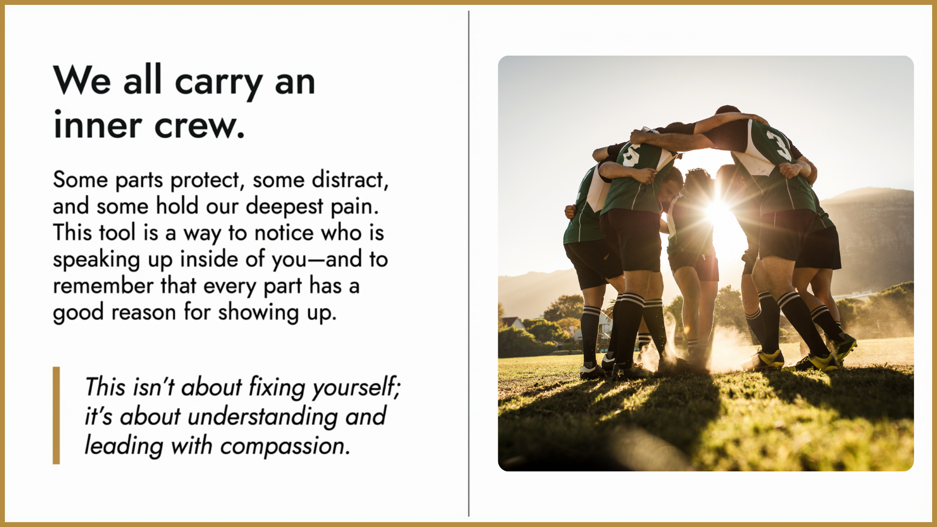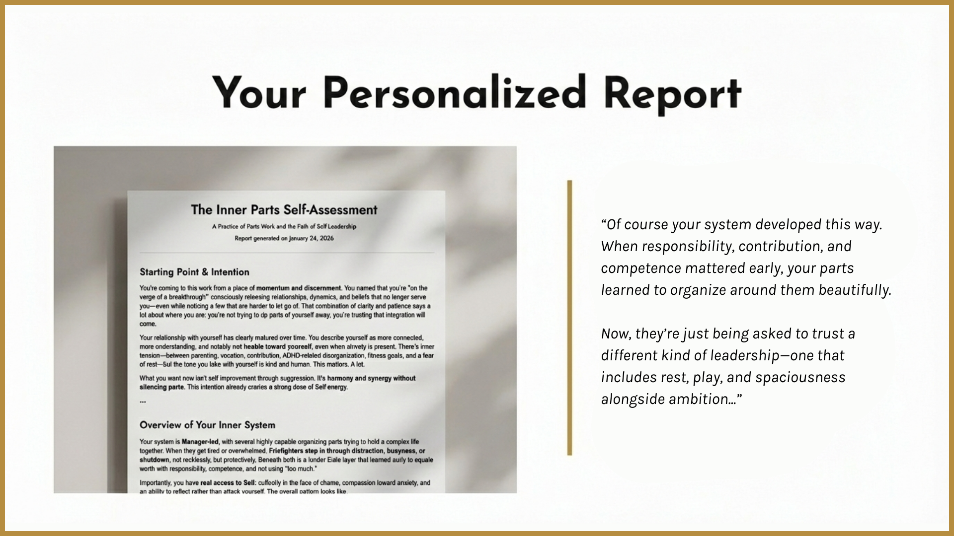 Get to know the voices in your head with this self-assessment + deep dive report. Discover the critic that pushes, the part that distracts or shuts down, and the tender places that carry old hurts—plus a 7-day micro-practice plan. A gentle, practical guide to turning self-criticism into compassion and building inner leadership.